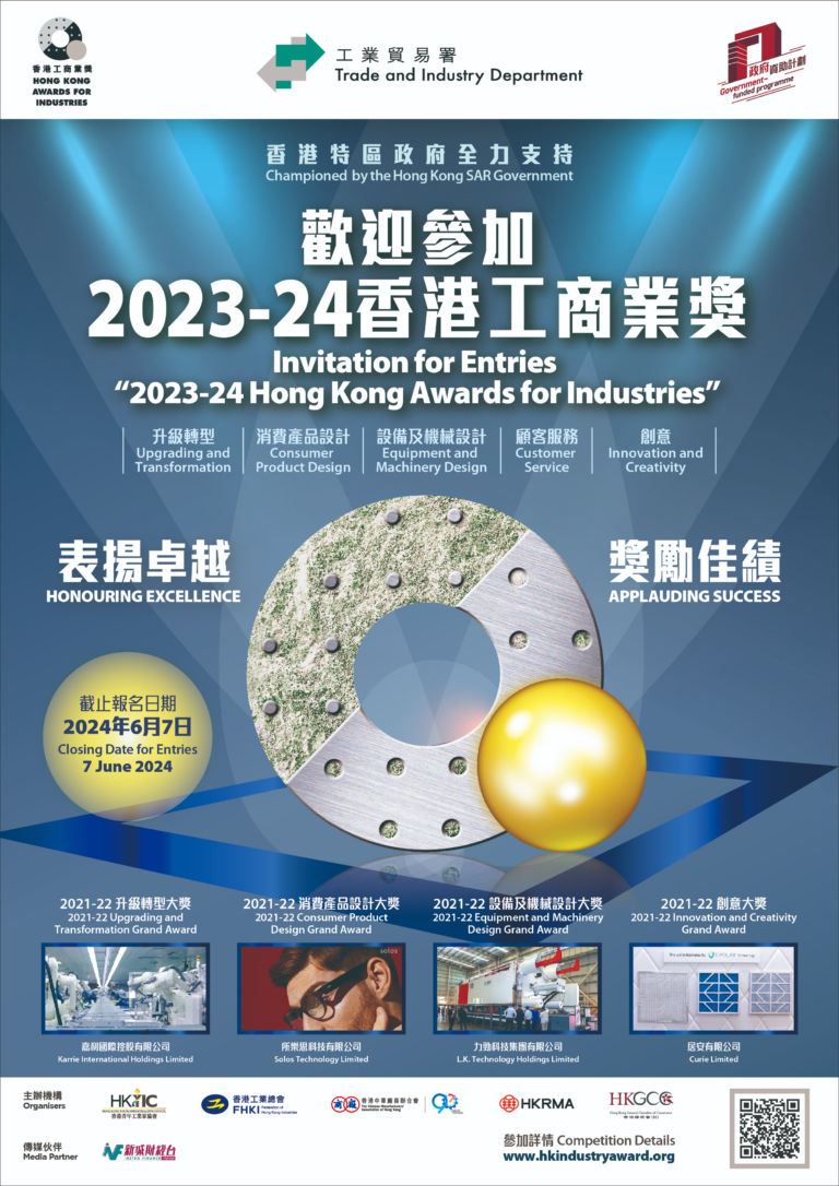 2023-24香港工商業獎現已接受報名,歡迎從事製造業及服務業的香港公司參加。2023-24香港工商業獎設有五個獎項組別,分別為「消費產品設計」、「設備及機械設計」、「顧客服務」、「創意」和「升級轉型」。截止報名日期為2024年6月7日。如欲查詢香港工商業獎的詳情,請瀏覽香港工商業獎網頁www.hkindustryaward.org。…