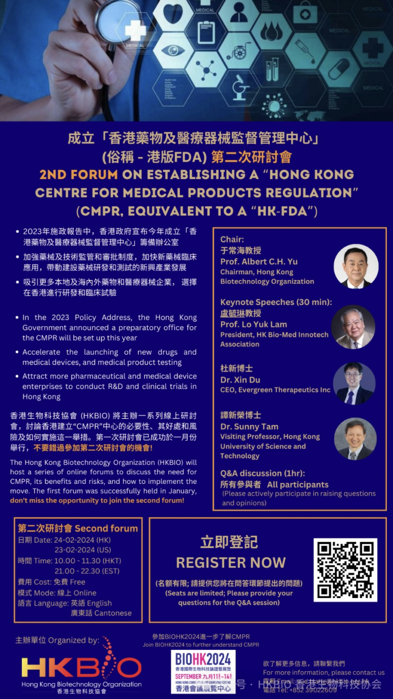 香港生物科技协会邀请您参加线上研讨会成立“香港药物及医疗器械监督管理中心”(俗称港版FDA)第二次研讨会时间:2024.02.24(星期六)…